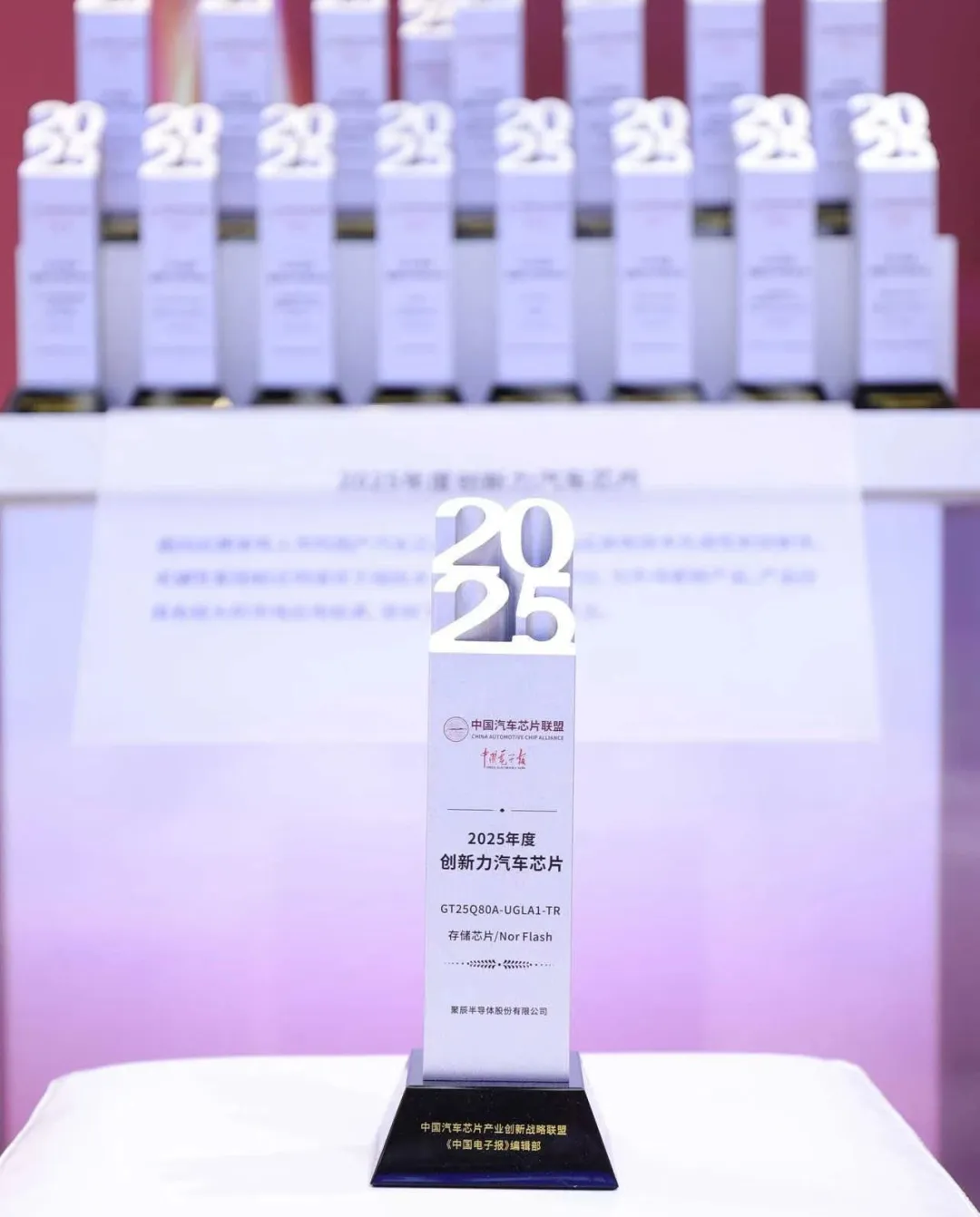 4 月 25 日,"2025 中国汽车芯片产业创新成果" 颁奖仪式在 2025 上海国际车展 "中国芯" 展区隆重举行。本次活动由中国汽车芯片产业创新战略联盟携手中国电子报共同主办,经过专家评委的评审与打分,金年会半导体的车规A1等级NOR Flash芯片GT25Q80A-UGLA1-TR凭借卓越的技术领先性和市场应用表现,一举获得 2025 年度创新力汽车芯片。